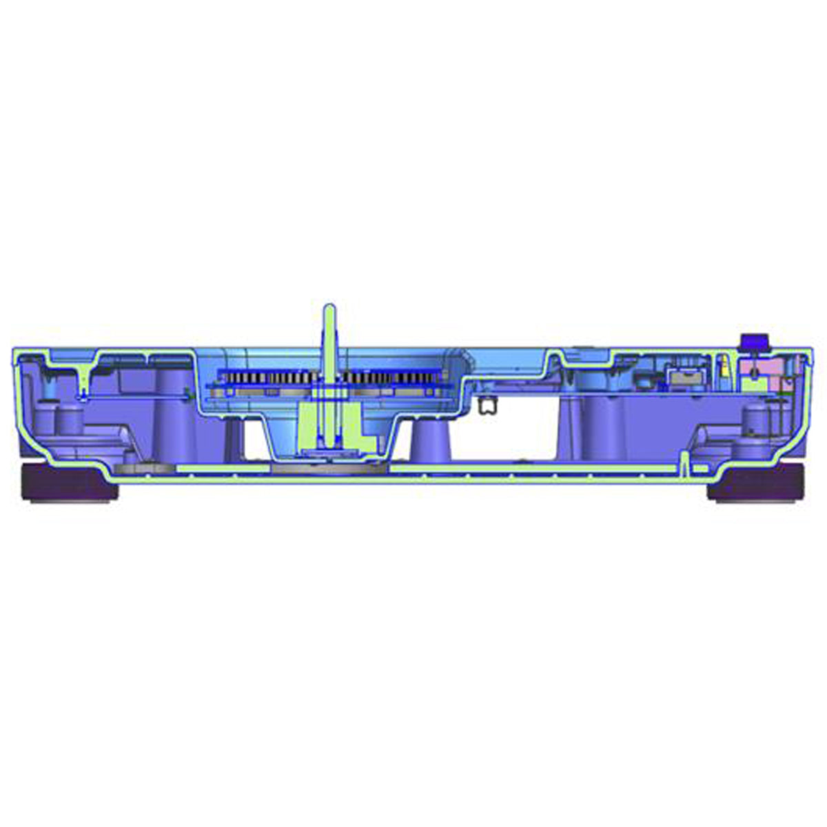The platter on which a vinyl record is placed features a two-layer structure: an aluminum die-cast platter reinforced with ribs on the reverse side, and a deadening rubber layer to eliminate unwanted resonance.